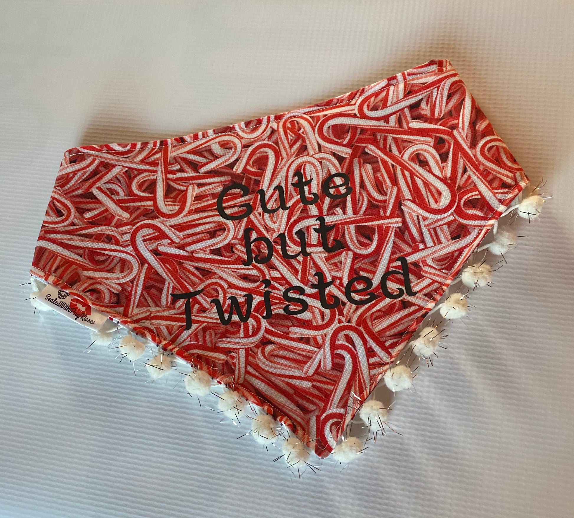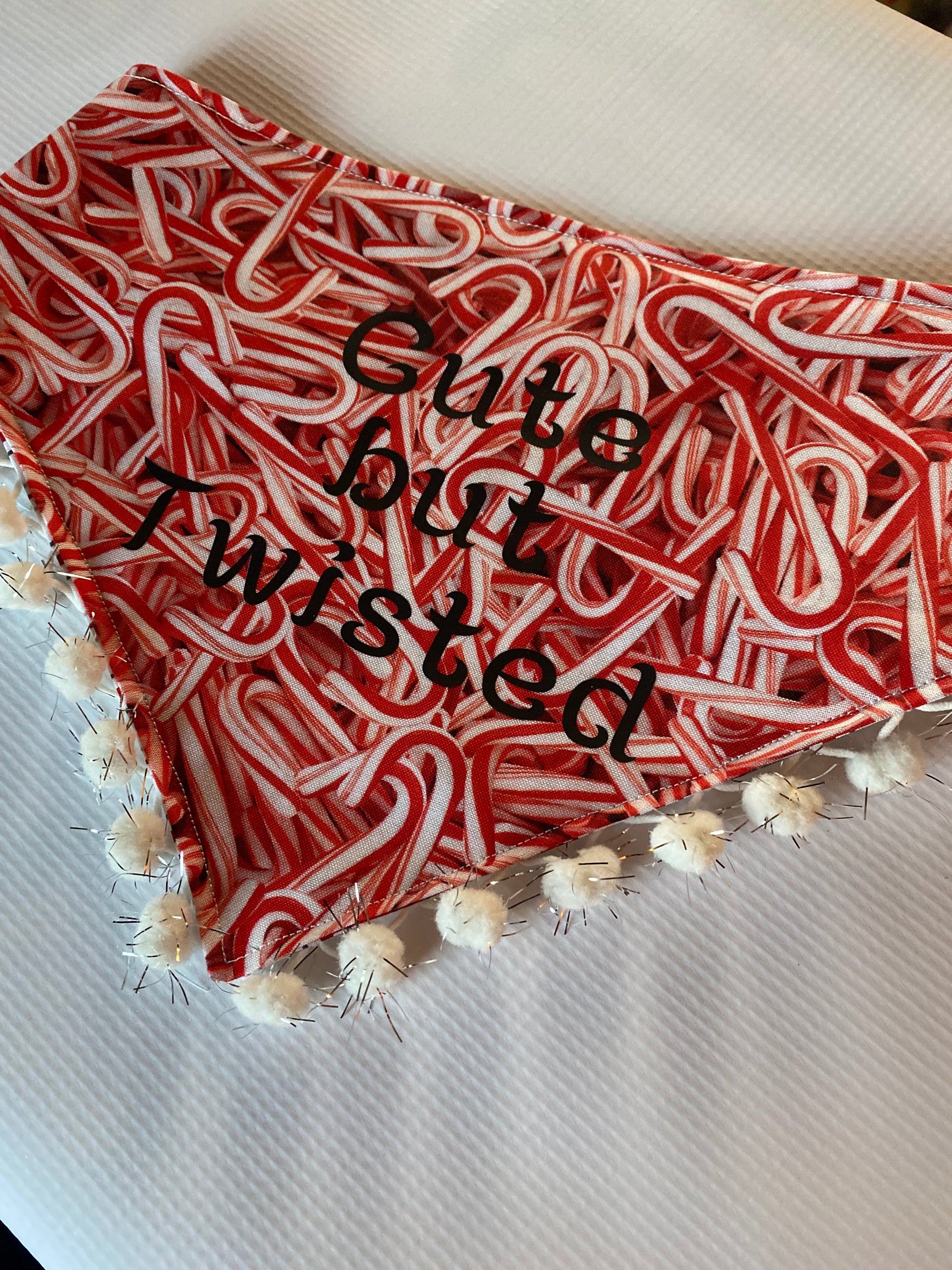 100% cotton "Cute but Twisted" bandana with easy and adjustable snap closure! Features adorable candy canes with "Cute but Twisted" in black vinyl on front.