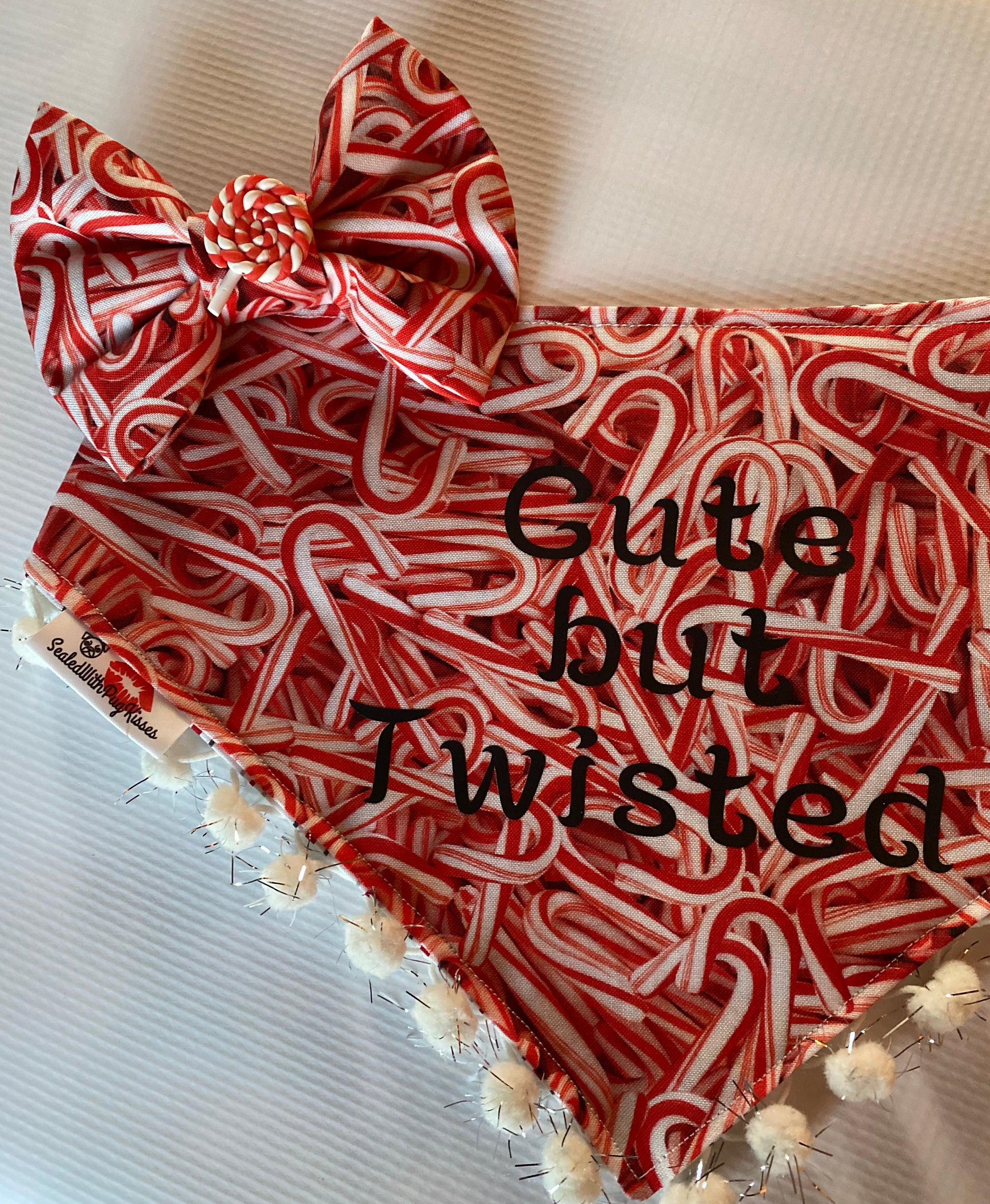 100% cotton "Cute But Twisted" bow tie features candycanes and a cute candycane pop button!