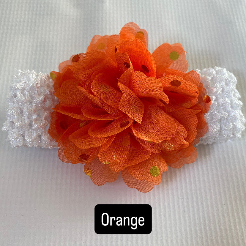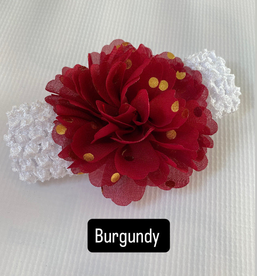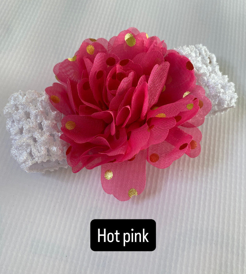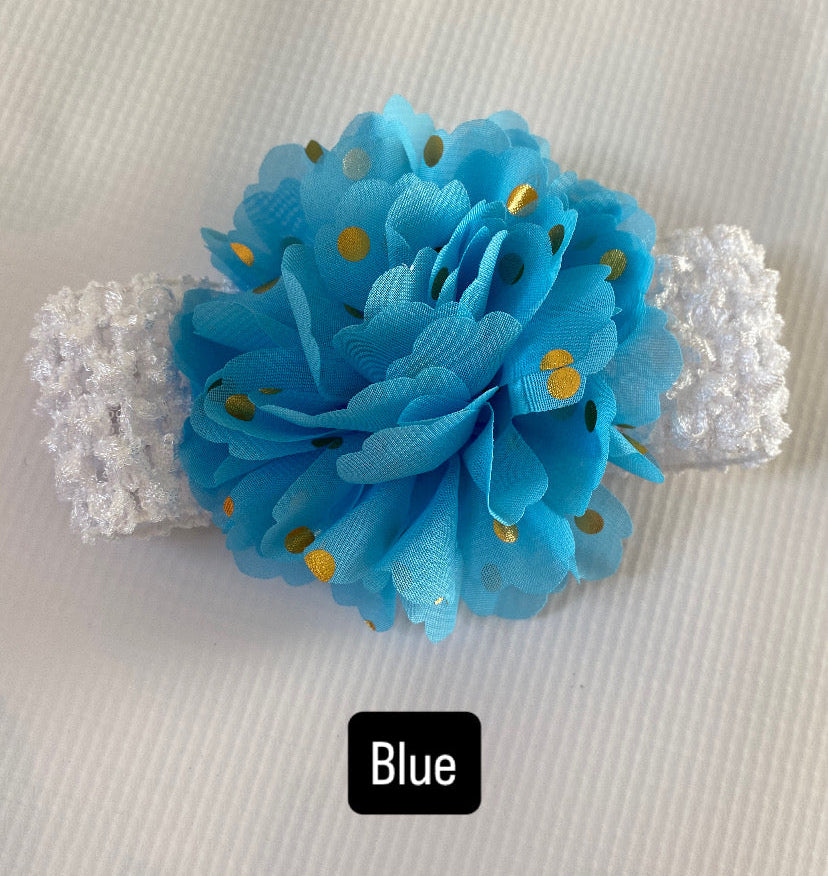 Choose from a variety of colors! Super cute and gold dots shimmer in the sunlight! All flowers are on a soft crochet neckband.