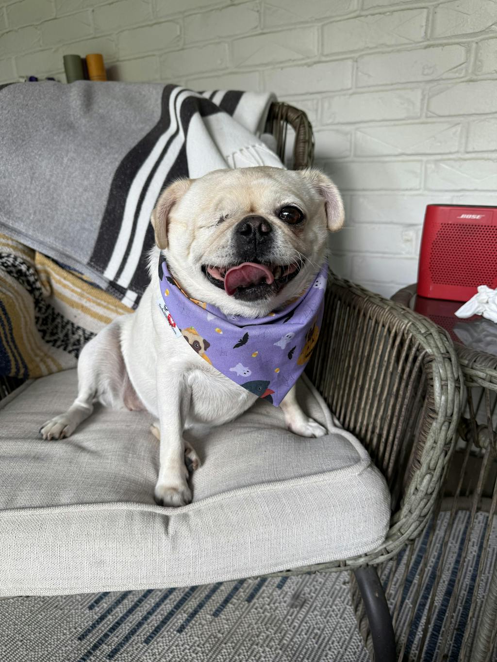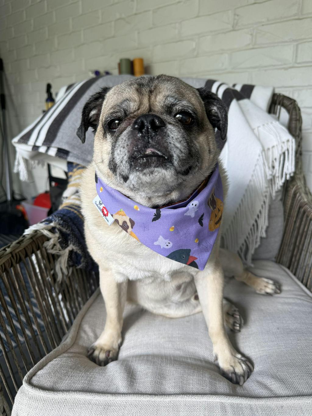 Each box contains a cute matchy bandana and scrunchie, a limited-edition pug magnet, delicious Farm to Pet Chicken Chips and optional fun add-ons!