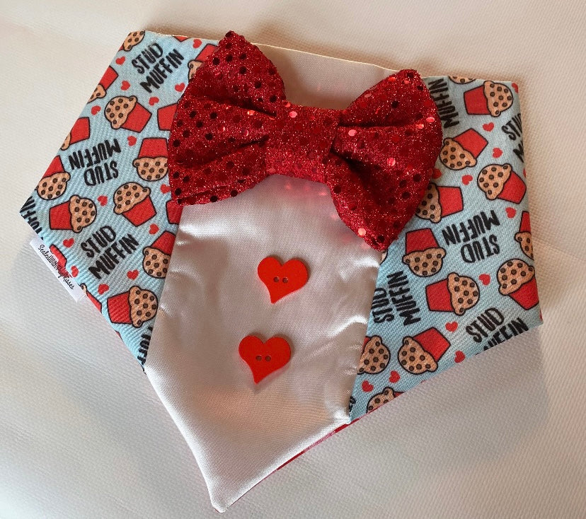 Introducing our "Stud Muffin" tuxedo bandana for Valentine's Day! The perfect accessory for your little man!